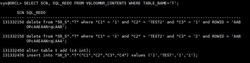 아래의 [그림-5]는 DDL_DICT_TRACKING 옵션 사용으로 SQL_REDO 문이 정상 출력되는 것을 확인할 수 있다.
