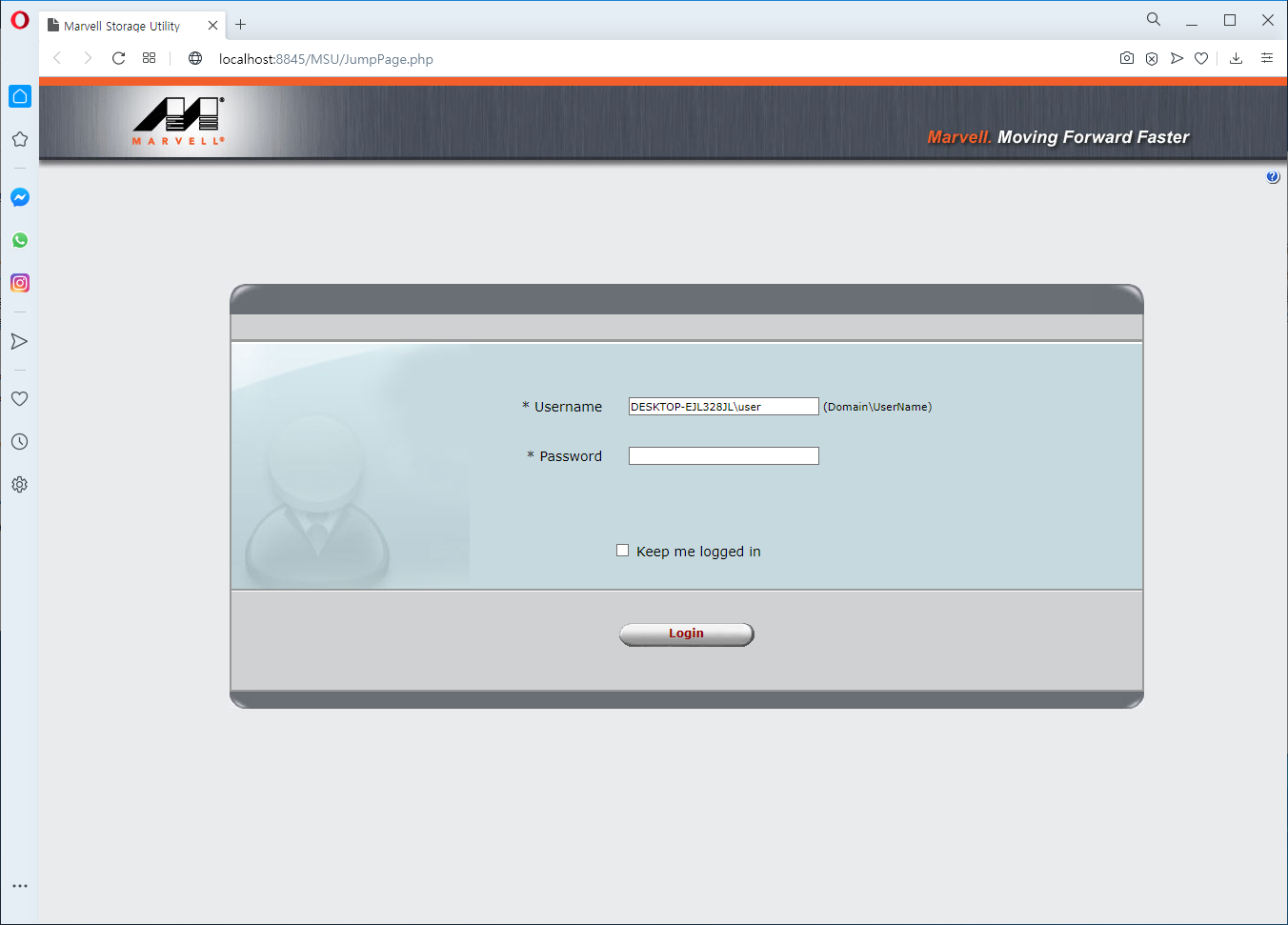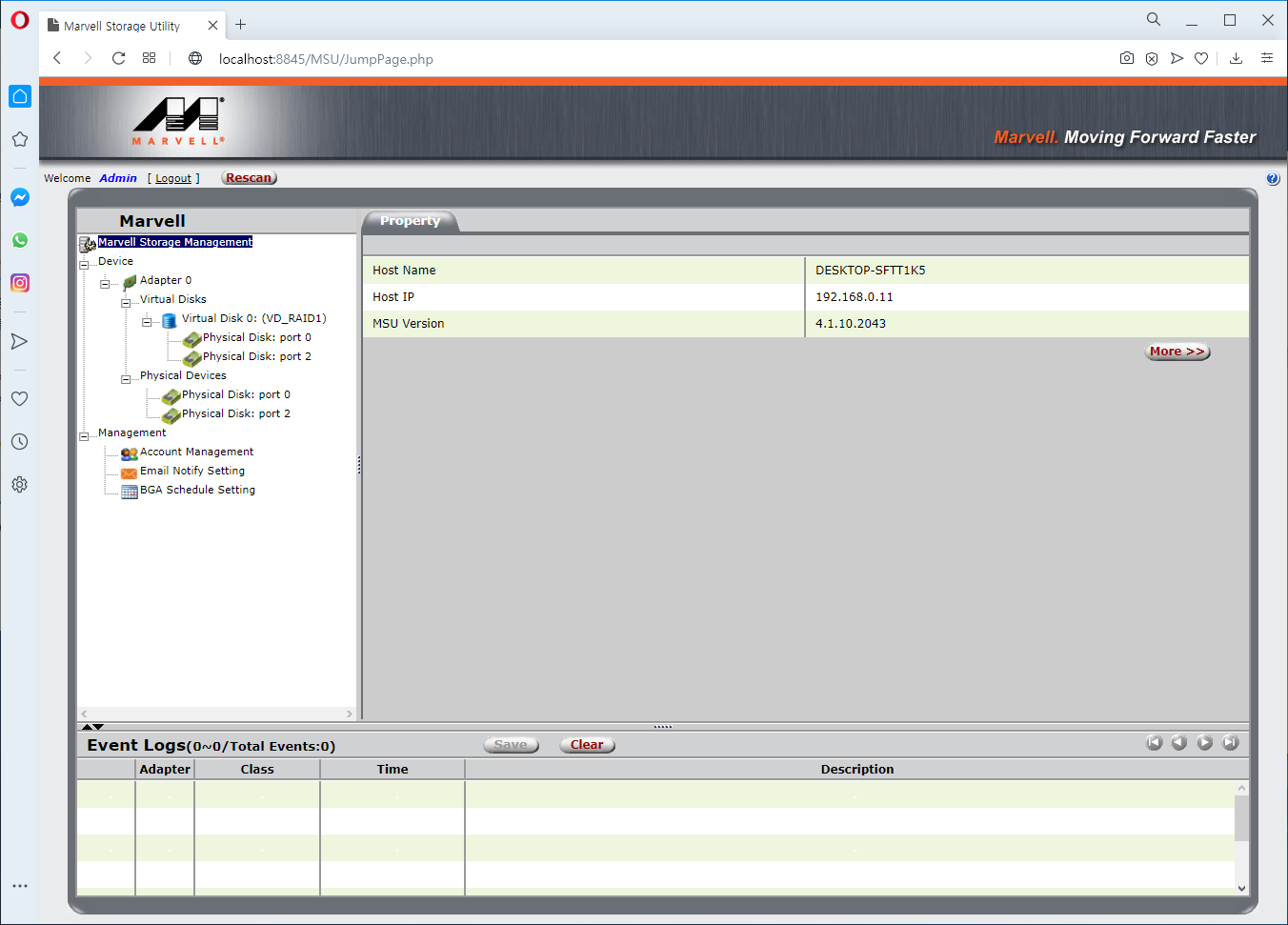 이제, RAID 구성을 위해서는 MSU(Marvell Storage Utility)를 설치해야 한다. 이곳에서 압축파일을 다운로드 한 이후에 압축 해제 후 MSU 설치를 진행하자. MSU를 설치한 이후에 바탕화면에 생성된 'Marvell Tray' 프로그램을 실행하자. 웹 기반의 MSU가 실행된다. Password에 실제 Windows 계정의 비밀번호를 입력하여 로그인하면 된다.