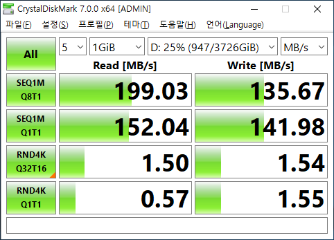 순차 읽기 성능은 기본 HDD의 성능(190MB/s)보다 약간 더 빠르고, 순차 쓰기 성능이 약 28% 정도 하락한다. 캐시가 없는 컨트롤러라 그런지 성능이 좋은 편은 아니다.