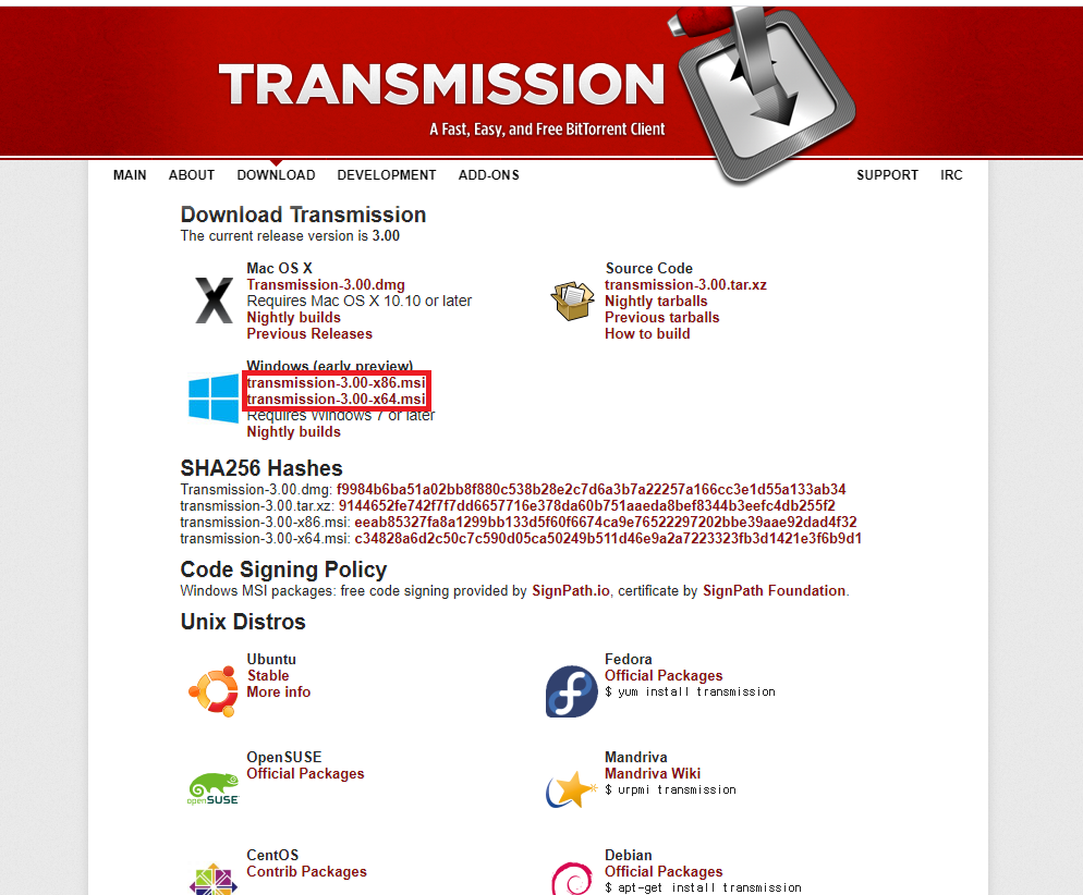 설치 프로그램은 트랜스미션 사이트에서 다운로드 하여 설치하면 된다.