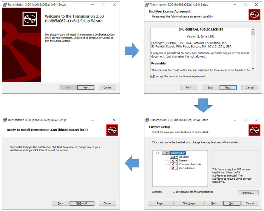 일반적인 토렌트 다운로드 목적인 유저는 트랜스미션 QT 클라이언트만 설치하여서 로컬 세션으로 사용해도 문제 없을 것이다. 또한, 모든 기능을 다 설치하여 접속 방식과 실행 방식에 따라서 적절히 사용해도 상관없다.