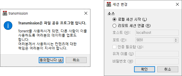 이제 트랜스미션을 설치하였다면 실행해보자(QT Client를 사용하는 방법을 기준으로 설명한다). QT Client를 실행하면 사용에 동의하고, 로컬/리모트 세션 선택을 해야한다. 로컬 세션을 위에서 설명하였듯이 QT Client를 단독으로 사용하는 것이고, 리모트 세션은 내부 혹은 외부의 데몬에 접속하는 것이다.