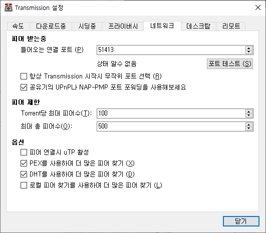 - Torrent당 최대 피어수(기본 50 -> 100), 최대 총 피어수(기본 100 -> 500) : 피어수를 늘려주어 속도를 높일 수 있다.