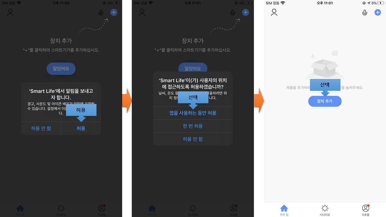 이렇게 계정 생성과 몇몇 장치 접근을 허용하면 장치를 추가할 수 있는 메인 화면으로 진입할 수 있다. 메인 화면에서 '장치 추가' 버튼이나 우상단의 + 버튼을 클릭하면 장치를 추가할 수 있다.