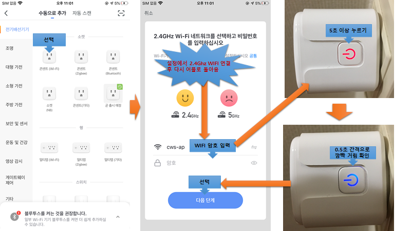 스마트폰은 WIFI에 연결되어야 하며, WIFI는 2.5 Ghz만 지원하므로 본인이 사용하는 무선 공유기의 2.5Ghz AP를 연결하도록 하자. 그리고 Smart Life 어플에서 WIFI 암호를 입력해 주고 스마트 플러그를 콘센트에 연결한 상태(빨간불)에서 5초 동안 버튼을 누르면 파란불이 빠르게 깜빡이는 상태가 된다.
