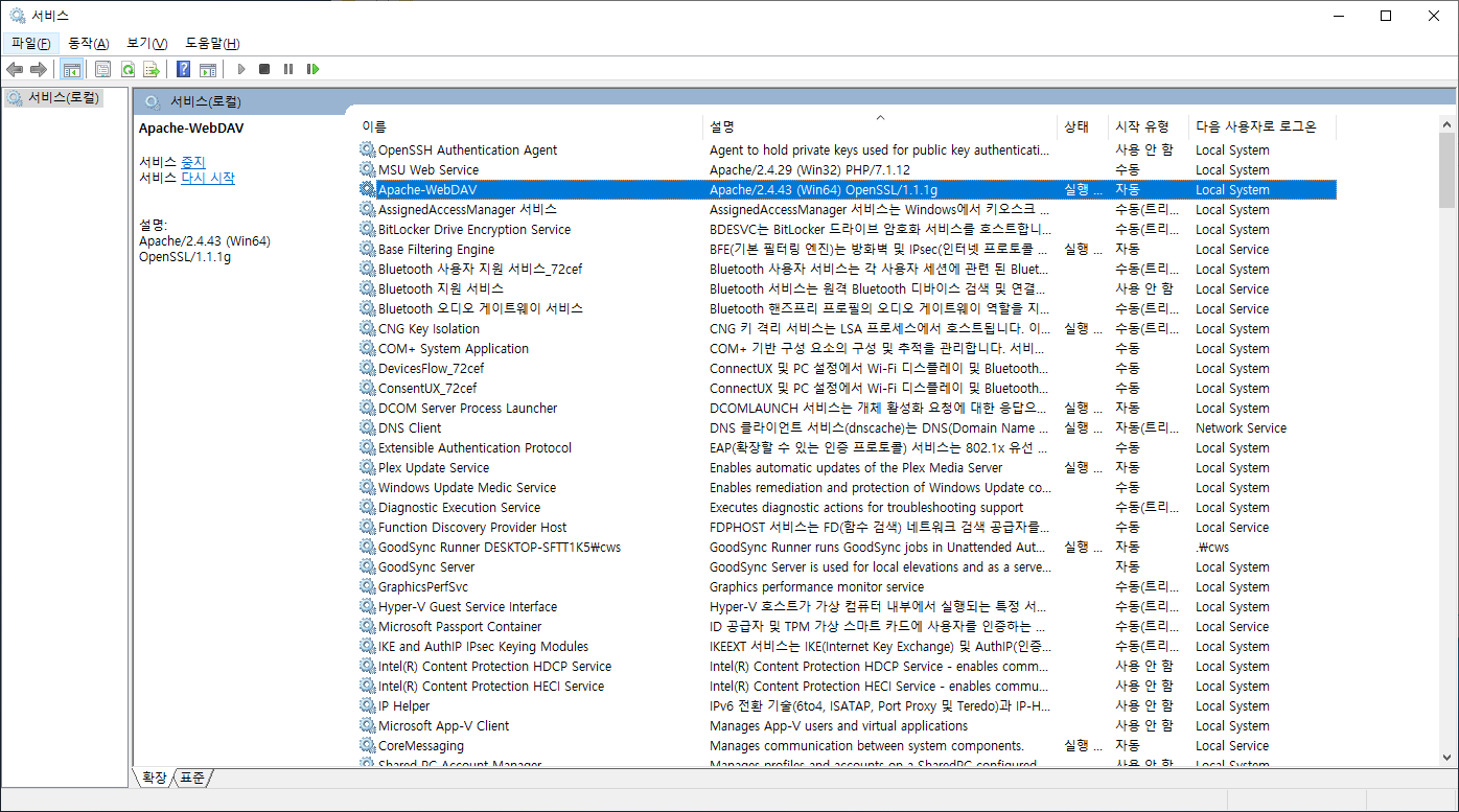 '시작 유형'이 자동으로 되어 있을 경우 윈도우 시작 시마다 아파치 서버가 자동 시작되어 WebDAV 서비스를 제공할 것이다.