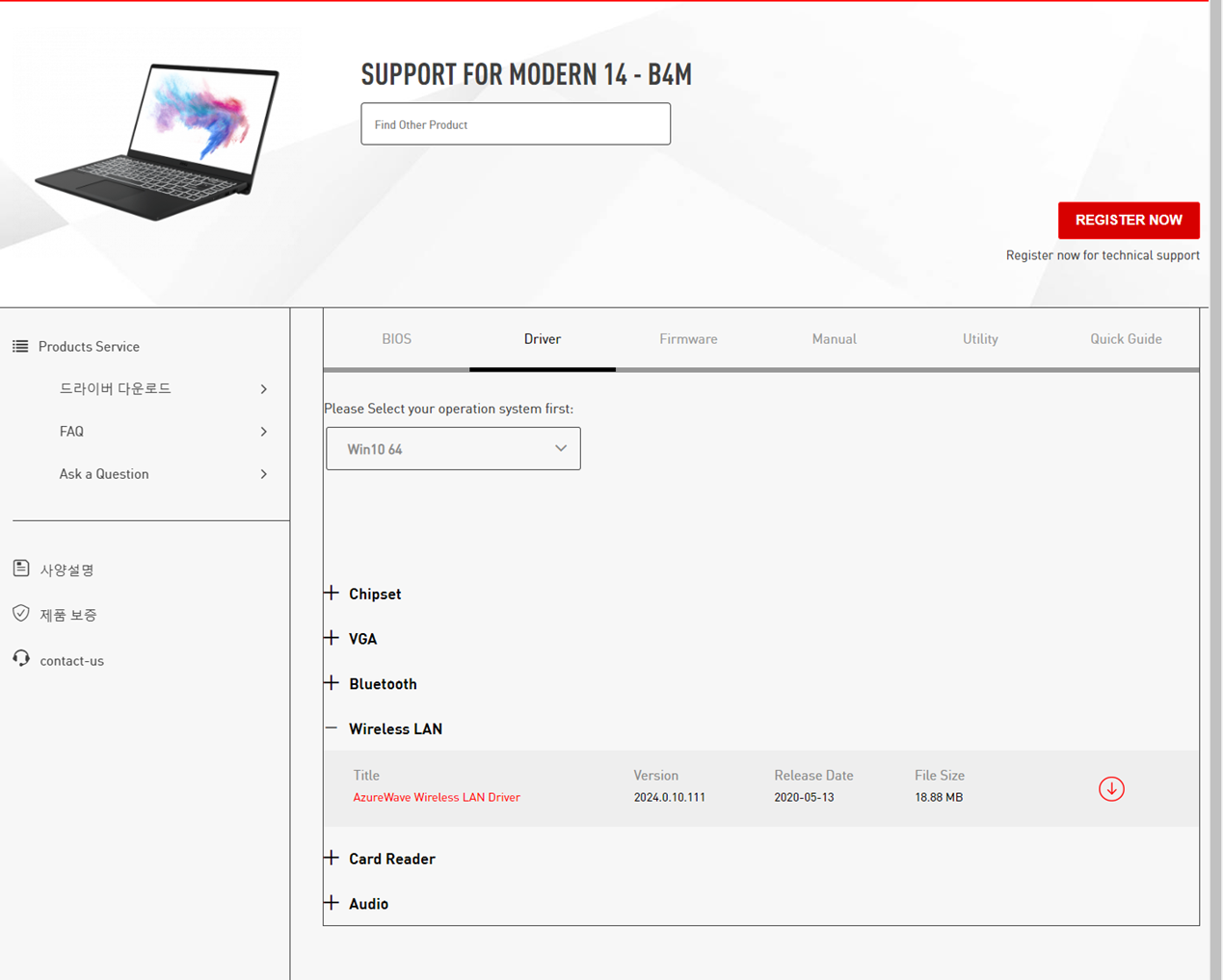 https://kr.msi.com/Laptop/support/Modern-14-B4MW#down-driver&Win10%2064