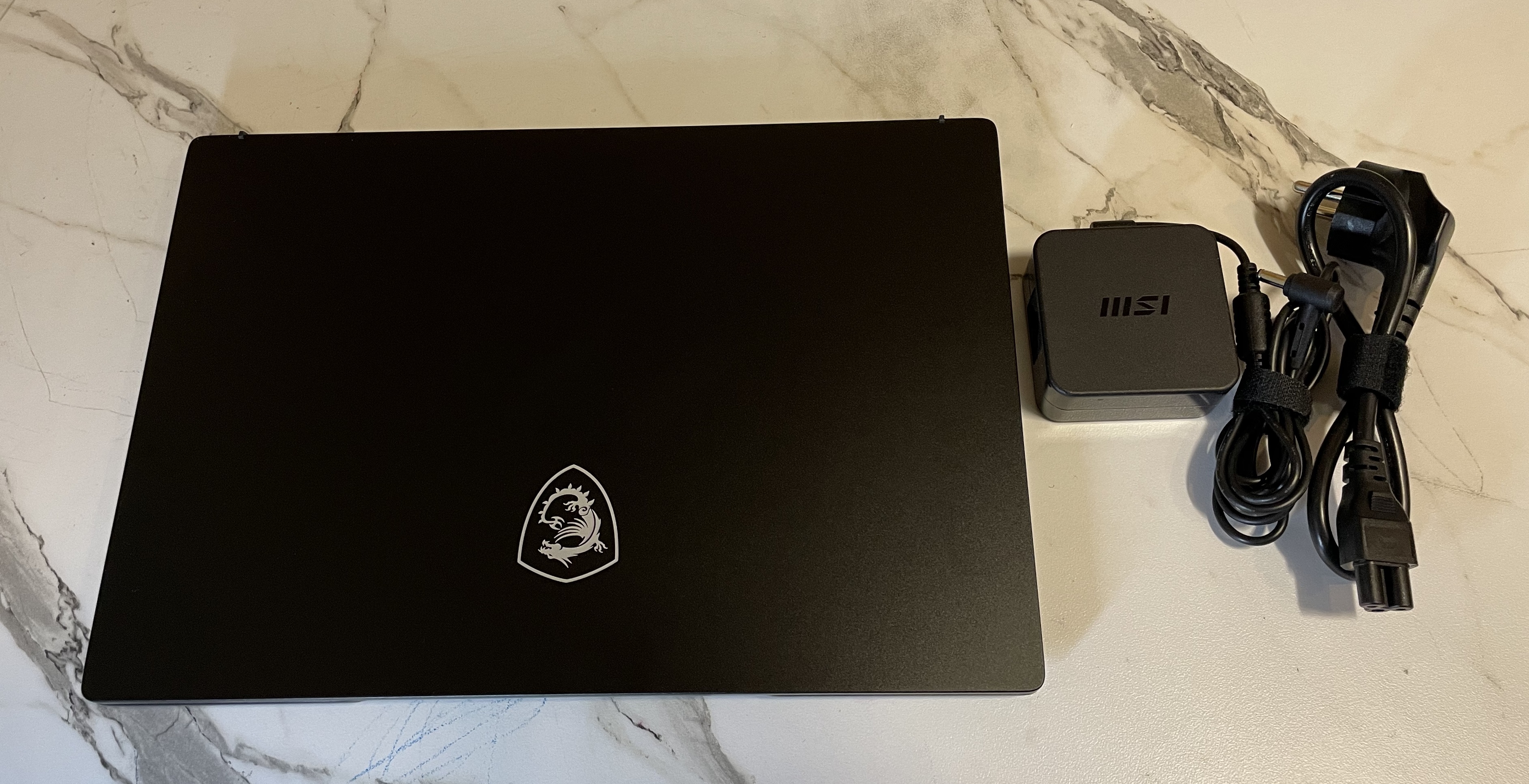 제품을 구입하면 본체, 충전기, 그리고 MSI 정품 슬리브 백을 함께 준다. 충전기는 일반적인 비즈니스 노트북에 맞게 65W이고, 정사각형의 매우 작고 아담한 크기이다. 휴대하기에 상당히 편하겠다.