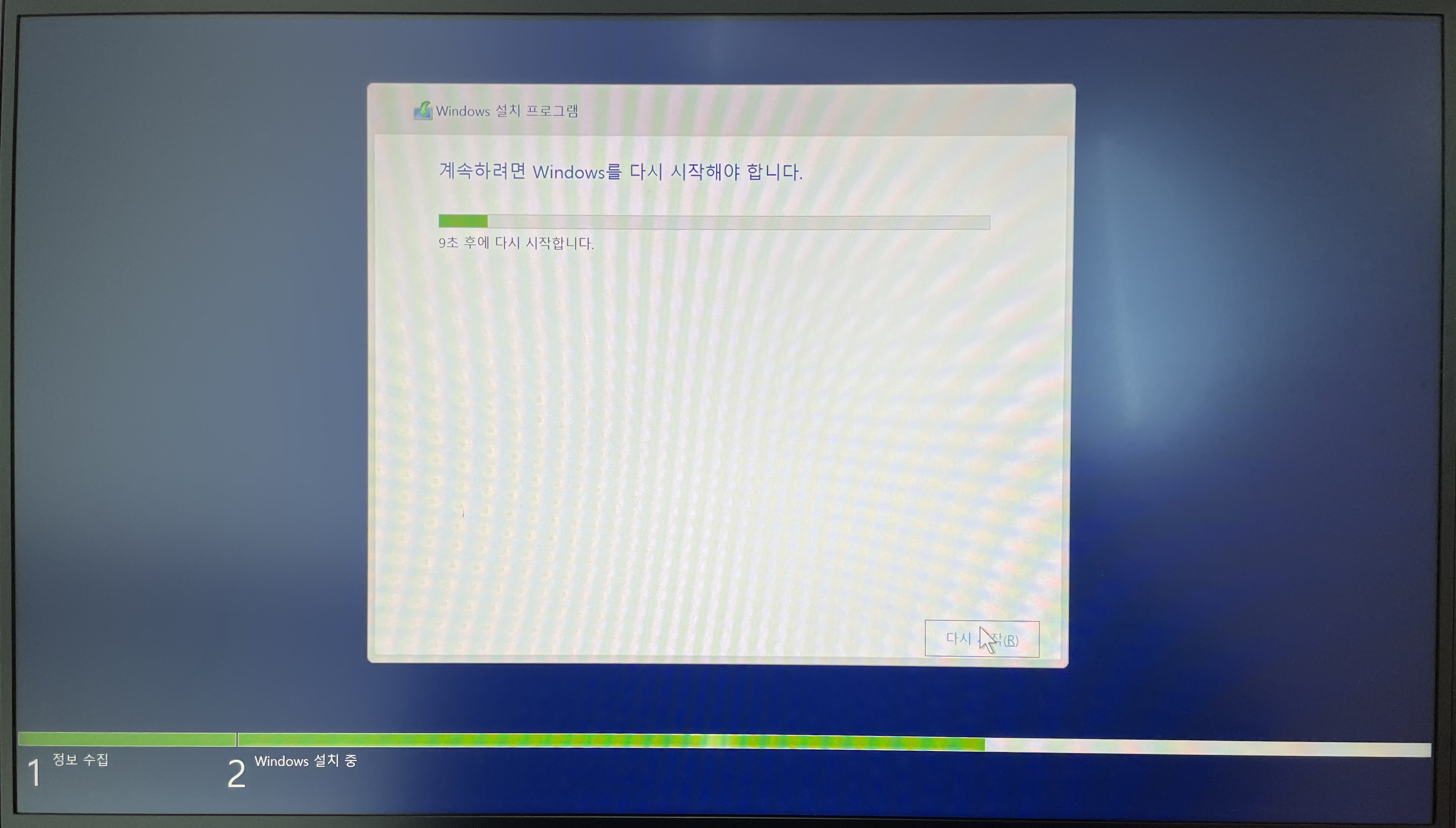 설치를 완료하면 위의 사진과 같이 재시작 화면을 볼 수 있는데, 이때 재시작 시에는 USB를 제거하여 다시 설치되지 않도록 해주어야 한다. (BIOS 모드 다시 진입하여 부팅 순서로 원래대로 변경하는 것도 함께 진행하면 좋다.)